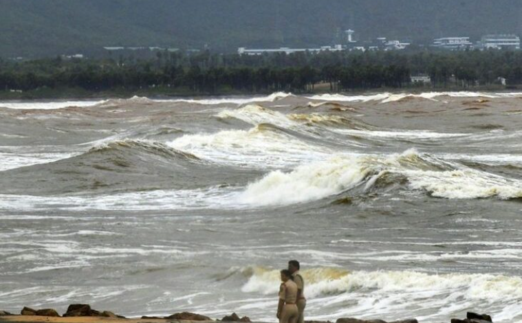विशाखापट्टनम में चक्रवात के प्रभाव से समुद्र में ऊँची-ऊँची लहरें उठीं।