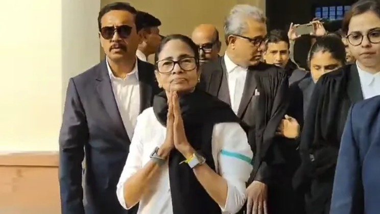 - पारंपरिक सफेद साड़ी और काले दुपट्टे में ममता बनर्जी कोर्ट पहुंची