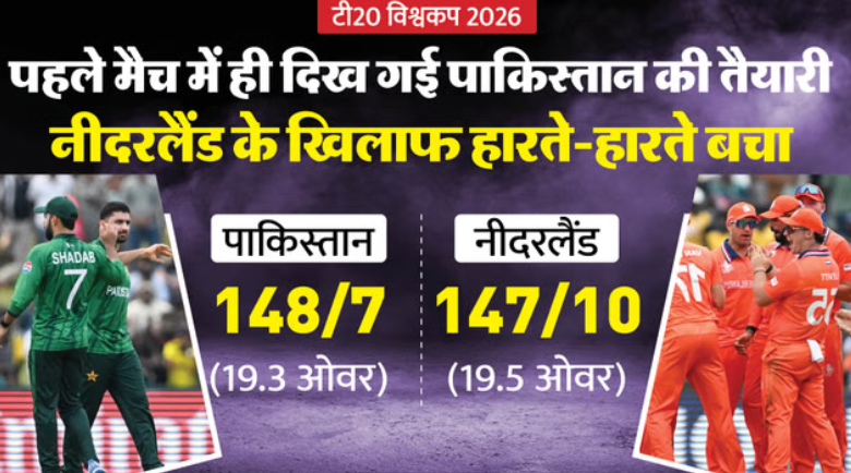 Pakistan vs Netherlands T20 World Cup 2026 : टी20 विश्वकप का आगाज हो गया है। पहले मैच में पाकिस्तान और नीदरलैंड की टीमें आमने-सामने थीं। यह मुकाबला कोलंबो के सिंहली स्पोर्ट्स क्लब मैदान में खेला गया। 148 रन का लक्ष्य पाकिस्तान की टीम 19.3 ओवर में जाकर हासिल कर पाई। एक वक्त तो नीदरलैंड ने पाकिस्तान की सांसें अटका दी थीं। विस्तार में पढ़ें मैच रिपोर्ट…